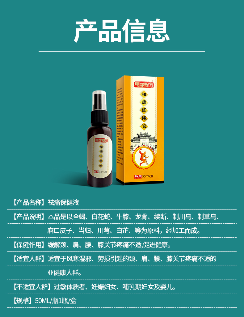 洛陽今世康外用產品生產廠家為您提供馬寺驗方祛痛保健液噴劑,草本選材嚴格,傳統配方,配比科學,用于頸肩腰腿關節不適時噴灑涂抹,并提供祛痛保健液使用方法,注意事項,正規廠家,百種批號,承接貼牌代加工,可批發可代理,量大從優。