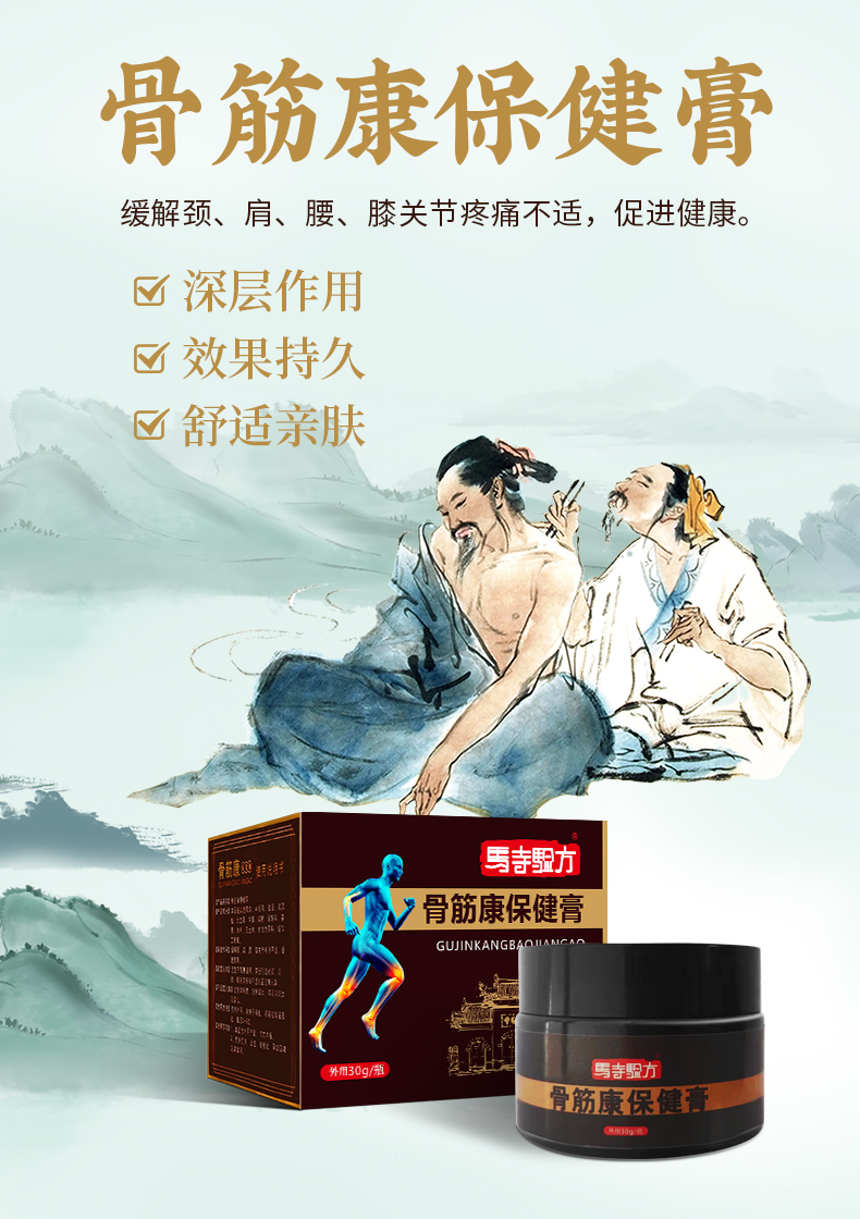 馬寺驗方骨筋康保健膏,用于頸、肩、腰、膝關節不適,草本原材濃縮萃取,配比放心,匠心熬制,涂抹方便,油膏質地,更易吸收,產品包裝、配方、效果、形狀、均可定制,源頭工廠,資質文號、生產備案齊全,生產能力強,出貨周期短,批發代理,oem貼牌代加工一站服務。